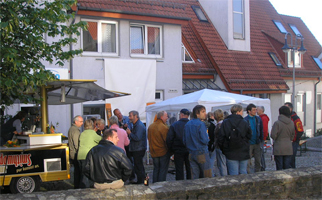 Hatte sich der Wetterbericht freitags noch recht hoffnungsvoll angehört, sah die Realität am Samstagnachmittag leider anders aus: grauer Himmel, dicke Wolken aus denen immer wieder Regen fiel, und ein unangenehmer kühler Wind. So waren es zunächst nur wenige Interessierte, die zum Simonsplatz gekommen waren und den Klängen aus den großen Musikboxen lauschten. Doch die Wettergötter hatten ein Einsehen, nach und nach setzte sich immer mehr die Sonne durch. Und allmählich füllte sich der Platz, die Stimmung stieg. Ein Hauch von Konzertatmosphäre wehte über den Simonsplatz, nur leider blieb es bei eher kühlen Außentemperaturen. Doch das schadete der insgesamt guten Stimmung keineswegs.