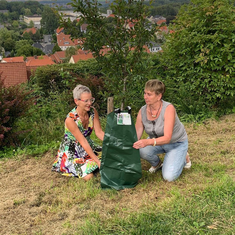 „Während des Kommunalwahlkampfs verzichten die Oerlinghauser Grünen in diesem Jahr auf viele Plakate. Anstatt das Geld in Wahlwerbung zu stecken, stecken wir als Grüne Oerlinghausen lieber die Bäume in Baumbewässerungssäcke. Sieben Grüne Ratsmitglieder setzen sich zurzeit für Grüne Belange im Rat ein – 7 Treebags sind angeschafft, die an der Streuobstwiese gegenüber der ehemaligen Jugendherberge den jungen Obstbäumen dort gewidmet werden“, so unsere Sprecherin Dagmar Allmendinger.
